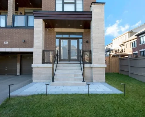 After the initial consultation, our team of specialists had a great idea of the vision and aesthetic the homeowner desired. We created a unique and original construction plan just to suit this specific customer’s needs. Once the plan was approved, our installation team quickly got to work. To accent the entire backyard and add additional elements of safety, we first installed an extremely secure back patio with railings and a stone staircase. This gives the homeowner more access to the backyard and adds effective usable outdoor space. The stairs off of the patio lead down to a beautiful and clean backyard entertainment area with shaded seating. Green space outfitted with mood lights creates a perfect mix of form and function. The client was so happy with the design created by Action Home Services, that they commissioned us to redo the exterior front entryway to compliment their gorgeous new custom patio and backyard space. Get in touch with Action Home Services today to start creating your dream backyard.