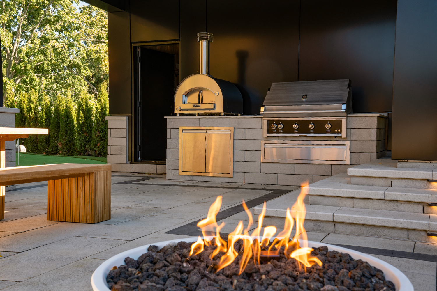 At the forefront of this project is a striking stainless steel and cherry red Wolf grill, ideal for summer barbeques (or any time a BBQ craving hits!) The design of the exterior kitchen combines natural wood elements with a sleek, modern finish. Rich-toned wood cabinetry complements the outdoors and provides ample storage for all of your needs. A generous countertop area allows ample space for preparing food, serving, and dining casually, a perfect spot to enjoy meals outdoors. The thoughtful layout encourages ease of movement, allowing multiple people to interact and cook with each other without crowding. It is truly the hub of activity!