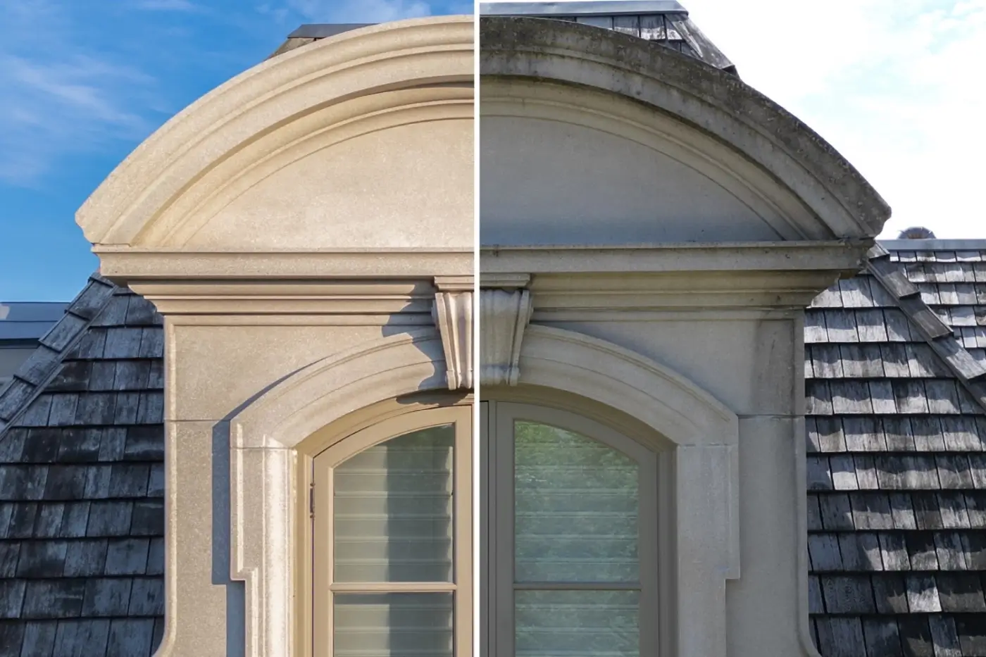 We started with the roof, cleaning the shingles to eliminate moss and lichen without compromising the material’s integrity. Moving on to the stone facade, we used a gentler pressure to clean the detailed carvings and stonework, preserving the craftsmanship while removing all the grime. For the driveways and walkways, which had accumulated a lot of dirt and stains over the years, we used a combination of high-pressure washing and eco-friendly cleaning agents to restore their original colour and texture. The transformation was incredible, with all the surfaces looking refreshed and revitalized.
