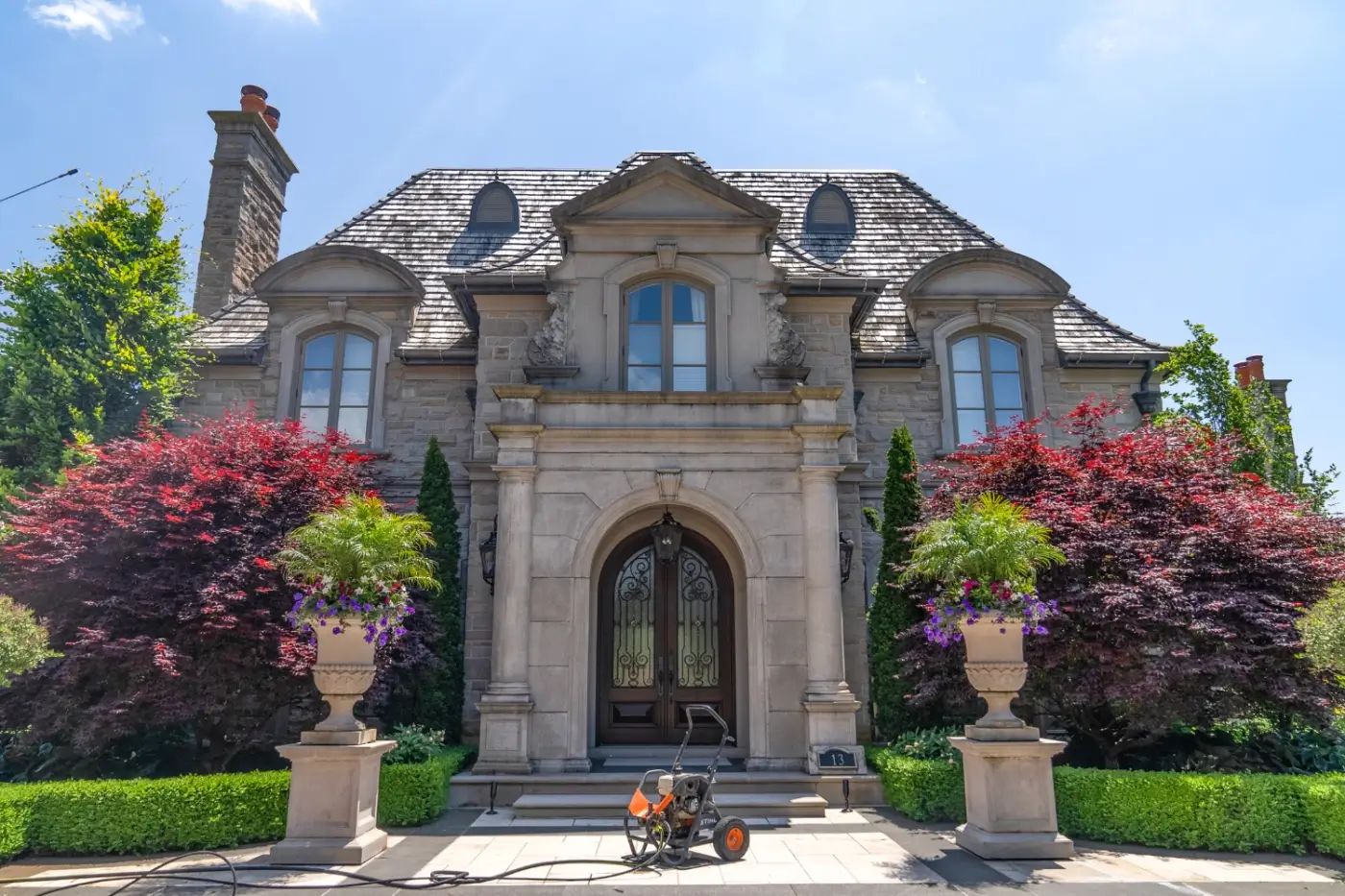 The project was extensive, covering the estate’s impressive facade, intricate stonework, wide driveway, and surrounding walkways. We began by thoroughly assessing all the surfaces to determine the best cleaning method, ensuring we wouldn’t cause any damage. Using top-notch power washing equipment, we carefully removed years of dirt, grime, mold, and mildew from every surface.